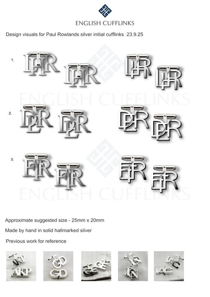 Deposit payment (50%) for three pairs of bespoke hallmarked sterling silver initial cufflinks. Please let us know by email which style you prefer.